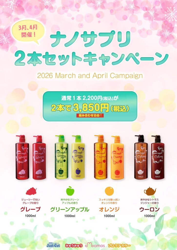 2026.03.02 キャンペーン 2026年3月、4月のキャンペーン 3、4月は「ナノサプリ2本セットキャンペーン」通常1本2,200円が2本で3,850円(組み合わせ自由)です! ナノサプリは 髪の奥まで届く小さな栄養成分で、髪を補修してしっとりさせる サロン専売品です 是非この機会にお求めください